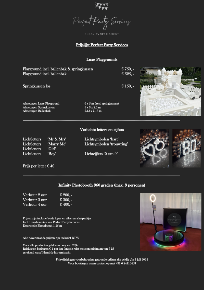 Bent u op zoek naar luxe playgrounds, lichtletters of photobooths? Bij Perfect Party Services bieden wij u de eyecatcher voor elke gelegenheid. Benieuwd naar de mogelijkheden, bekijk hieronder ons aanbod of neem een kijkje op onze website.